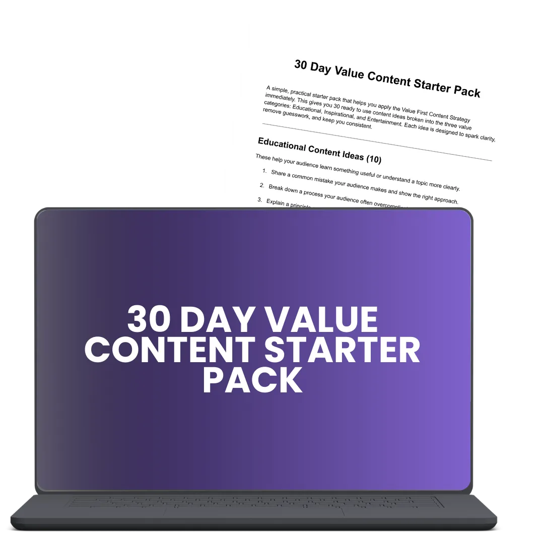 BONUS #3: 30 Day Value Content Starter Pack - Thirty ready to use content ideas across educational, inspirational, and entertainment categories, designed to help you take action fast without creative burnout.