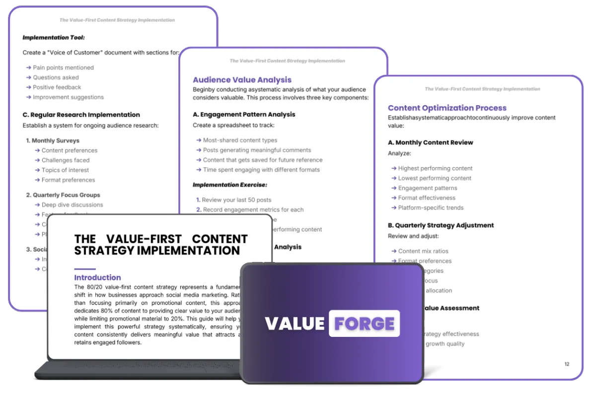 ValueForge Strategy Guide: A complete walkthrough of the Value First method that shows you how to understand your audience, plan meaningful content, and build a system that keeps you consistent. Everything is broken down into clear steps you can follow at your own pace.